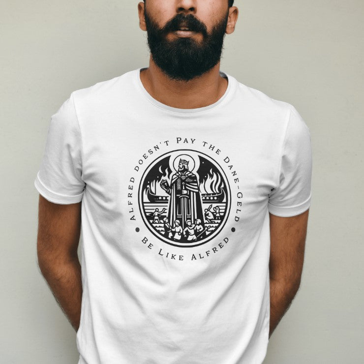 Embrace the indomitable spirit of Alfred the Great with this distinct t-shirt, a tribute to the Saxon king who masterfully balanced the sword and Scripture.